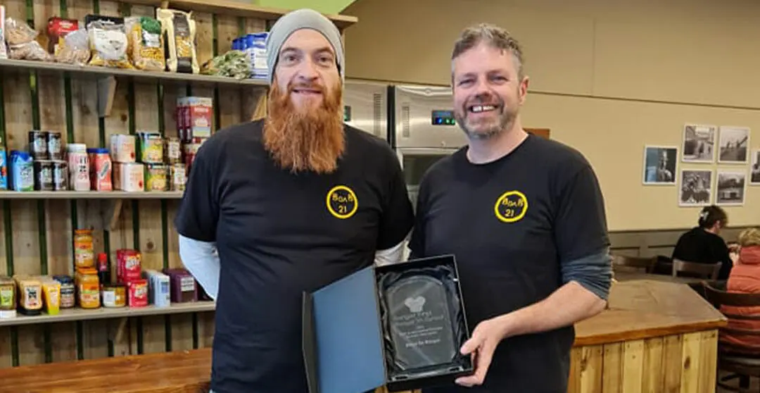 Dafydd Hardy yn sgwrsio gyda James sy’n rhedeg @bwyddabangor menter bwyd cymdeithasol unigryw.